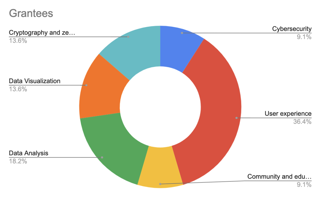 不同类别项目的获奖比例也有所不同,其中,用户体验类项目占比最高,为 36.4%,数据分析类项目为 18.2% 位列第二,密码学与零知识证明、数据可视化类项目各占 13.6%,网络安全及社区与教育类项目各占 9.1%: