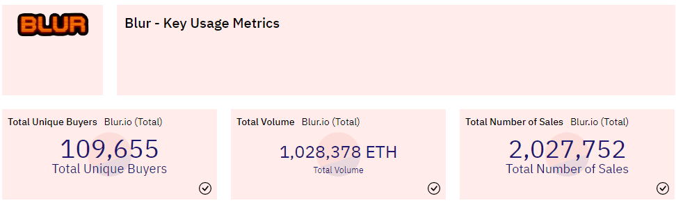 Blur的迅猛发展更是加剧了OpenSea的担忧,据Dune Analytics数据显示,其平台交易额已突破100万枚ETH,达到1,028,378 ETH,按照当前价格计算约合17.5亿美元,销售总量也超过了200万笔,当前达到2,027,752笔,此外Blur平台独立买家数量为109,655个。