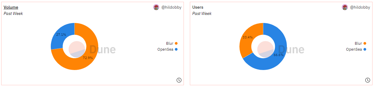Blur近期交易额激增很大程度上与其空投BLUR代币有关,是否能够维持更长久的有机增长还不确定。需要注意的是,OpenSea的用户量几乎是Blur的两倍(如下图所示),这意味着他们依然拥有较强的用户基础,更重要的是,OpenSea至今没有发布自己的治理代币或平台币,一旦OpenSea尝试Blur的发币策略,势必给整个NFT市场格局带来影响。