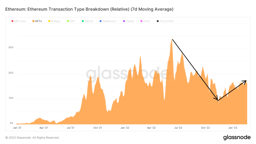 近期NFT类交易次数及占比的增长始于去年11月下旬,这改变了2022年6月以来NFT类交易次数下跌的趋势。同时,受到近期交易市场Blur空投代币的利好刺激,在空投之前的2月9号、10号和11号,NFT类交易次数还形成了一个小高峰,这3天的日交易次数(7天均值)都超过了19.2万次。