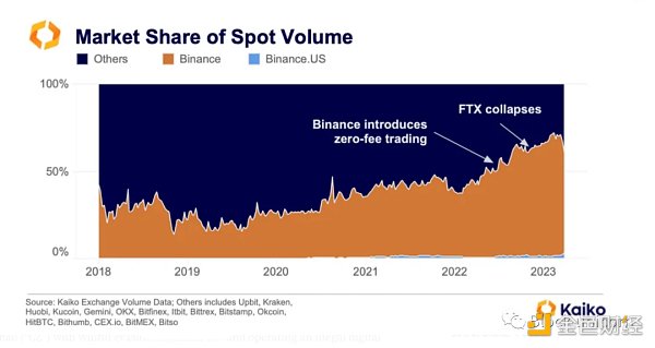 币安的市场份额已经下降,并且在未来几个月中可能会进一步下降,尽管很难确定这是因为它在最常交易的 BTC 交易对上重新实行了费用,还是因为美国机构停止在该交易所交易的原因。幸运的是,Kaiko 拥有各种流动性和交易指标,可以让我们了解该交易所如何应对其最近的变化和这项监管行动。