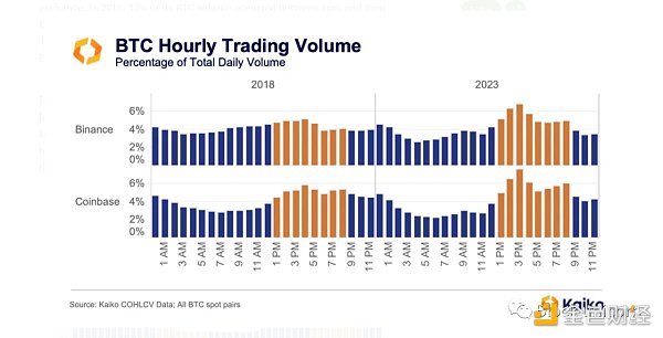 Binance 的交易量不成比例地偏向于美国的交易时间(橙色),实际上与美国的交易所Coinbase很相似。2018 年,其 35% 的BTC交易量发生在 UTC 下午 1 点至 8 点(美东时间上午 9 点至下午 4 点),而 Coinbase 的数字是 41.5% 。2023 年到目前为止,Binance 的 BTC 交易量有 43.4% 是在美国时间段,略微落后于 Coinbase 的 47.5% 。