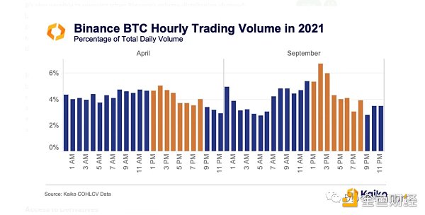 也可以确定 Binance 的交易量分布何时发生了变化: 2021 年春末夏初,中国对加密货币交易进行了打击。在短短几个月内,Binance 从一个相对平坦的小时分布变成了一个明显偏向欧洲和美国交易时间的分布,美东时间上午 10 点的交易量是美东时间凌晨 1 点的两倍多。