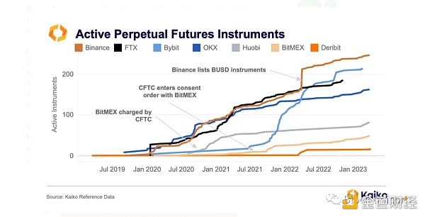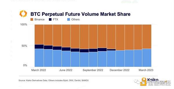 币安多年来一直主导着期货交易量,并且自 FTX 的崩溃以来,已经连续多次为 Kaiko 覆盖的所有 BTC 永续合约的交易量提供了超过一半的交易量。(请注意,自 12 月份以来,随着OKX和 Deribit 的增长,其市场份额实际上已经减少。)