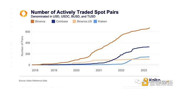 更多现货交易对从更普遍的意义上讲,Binance 与美国交易所相比的另一个优势是它可以自由上市新的代币进行现货交易。截至目前,Binance 的活跃交易对是 Coinbase 的两倍以上,是Kraken的四倍,是 Binance.US 的六倍。