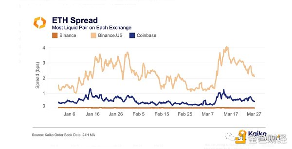 更深层次的流动性流动性在加密货币中是最重要的,特别是对于那些建立或出售大量头寸或频繁交易的机构。在这方面,Binance 再次取得了很好的成绩,截至本文写作时,其利差比 Binance.US 收紧了 36 倍,比 Coinbase 收紧了 8 倍。不出所料,Binance 的 BTC-USDT和 ETH-USDT 的价差可以说是最小的。