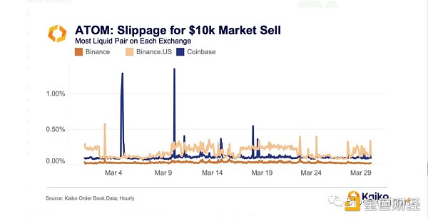 这自然吸引了频繁交易的机构。币安的小币种流动性也非常深。下面是一个表格,显示了一个名为 ATOM 的市值排名前 25 的代币的模拟销售价值为 10, 000 美元的滑点,该代币在这三个交易所上都有交易。在 Binance 上的滑点为 0.03 %,从未超过 0.1 %;在 Coinbase 上的滑点为 0.11 %,在 Binance.US 上波动在 0.1 %和 0.3 %之间。