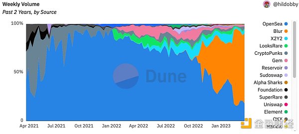自推出以来,Blur 已向各种用户类别公开宣传其空投代币的意图,而 市场的大部分最初采用率都来自于试图最大限度地提高其空投资格的用户。目前,Blur 处理了每周 交易量的 72% ,部分原因是预先宣布了其第二季空投。