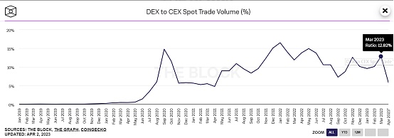 去年FTX的暴雷和最近硅谷银破产事件对加密行业造成了沉重的打击,但是也在推动加密货币交易向去中心化的方向倾斜。