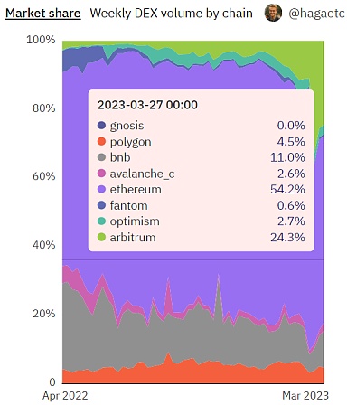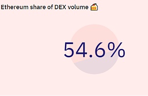 DEX交易量中,以太坊主链上的DEX交易量占比为54.6%。