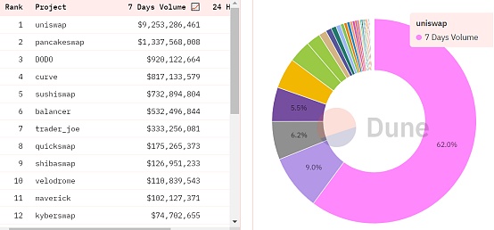 7日交易量排名中,Uniswap以较大的优势占据第一名,交易量占比为62%,龙头效应明显,而pancakeswap、DODO、curve、sushiswap分别排在第2至第5名。