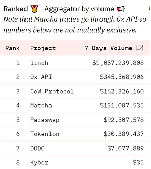 DEX聚合器的7日交易量方面,1inch、0x API、CoW协议、Matcha、Paraswap占据前五位,其中1inch的领先优势比较明显。