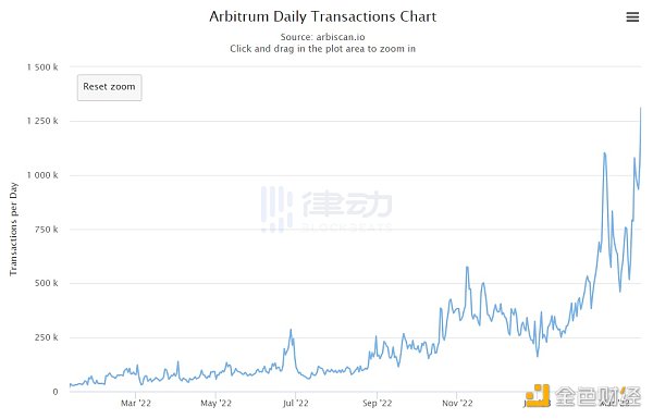 自推出上线以来,Arbitrum 经历了一系列发展,包括部署测试网络、推出 Odyssey 项目和发布 Nitro。最近的 Nitro 升级和即将推出的 Stylus 编程环境展示了该平台致力于为以太坊用户提供快速、高效和低成本的解决方案。甚至在 3 月 23 日,Arbitrum 日交易量创下了 130 万的历史新高,相比之下,以太坊主网的交易量为 108 万笔。