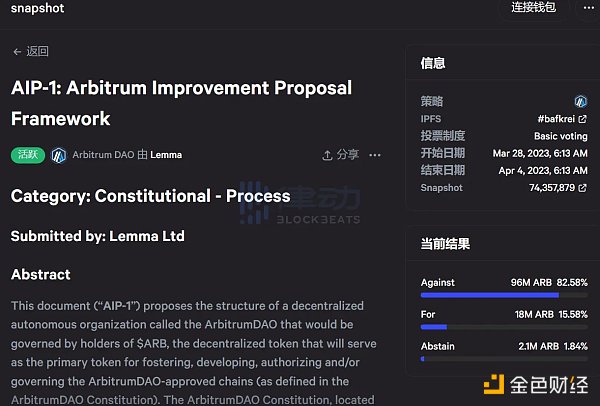 3 月 28 日,Arbitrum 社区在 Snapshot 上发起 Arbitrum Improvement Proposal 1 (AIP-1) 提案投票,提案内容为拟引入由 ARB 持有者管理的去中心化自治组织结构 ArbitrumDAO,Arbitrum 基金会也将为 ArbitrumDAO 社区服务并受其管理。