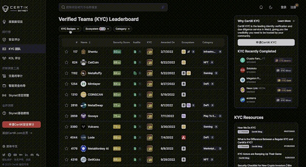 Web3.0 KYC团队榜则根据项目所获取的CertiK KYC徽章状态进行公示和排名。已通过严格背景调查的项目团队将获得CertiK KYC徽章,CertiK将根据项目团队提供的可验证信息和信息等级授予其KYC黄金徽章、KYC白银徽章或KYC青铜徽章。KYC徽章会表明我们知晓项目背后的团队并已经做过了符合CertiK KYC 标准的调查和验证,也代表项目团队对履行合规措施的承诺。