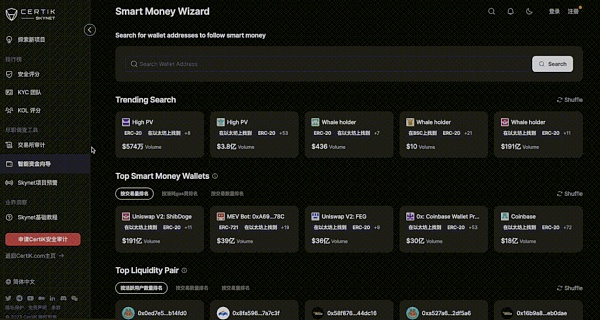 智能资金向导是智能货币钱包分析器功能的接入点,可以让用户直接搜索钱包地址并查看钱包搜索趋势、智能资金榜及流动性交易对榜。钱包分析器提供了对钱包地址的分析,并通过显示关键钱包特征、钱包之间的关系和代币交易活动的可视化图片,使用户更容易解读钱包之间的链上交易。