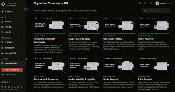 Skynet 101是一个教育性质的资源中心,旨在帮助用户了解和掌握CertiK平台的特性和功能。该资源中心提供教程和指南,并且跨越了从网站导航基础知识到CertiK高级分析工具。