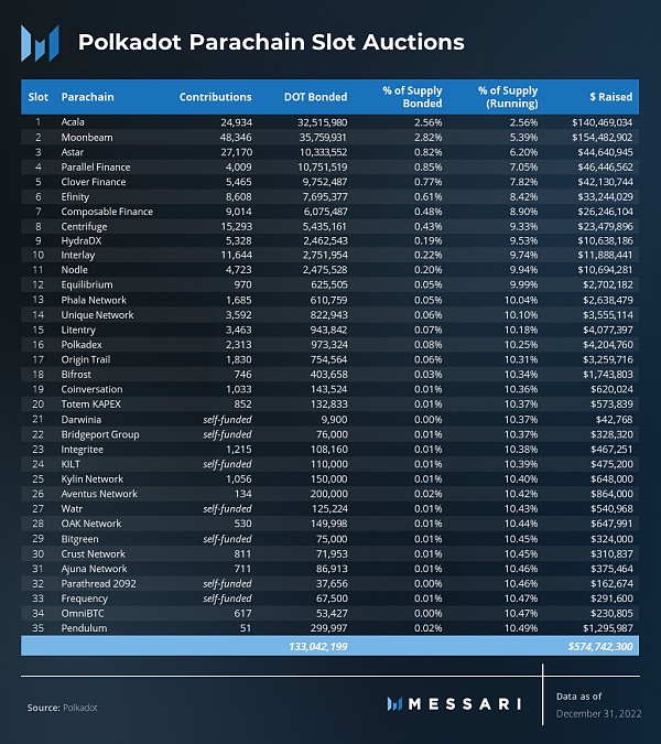 在第一次平行链槽位拍卖一年后,已经拍出了 35 个槽位,总共绑定了 1.33 亿个 DOT(占总供应量的 10.5%)。2023整年将定期进行平行链拍卖,每两周一次。