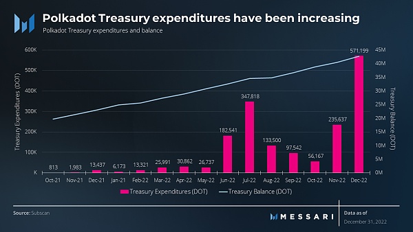 2022年期间金库支出了180万DOT(800万美元)。2023年新的OpenGov模式的实施可能会导致金库的使用量增加,如本报告下文所述。