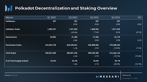 有趣的是,尽管推出了提名池,但 Polkadot 的质押指标在第四季度出现了下降。总持有量环比下降 18%,从 6.98 亿股下降到 5.72 亿股,导致流通供应量的百分比从 56% 下降到 45%。