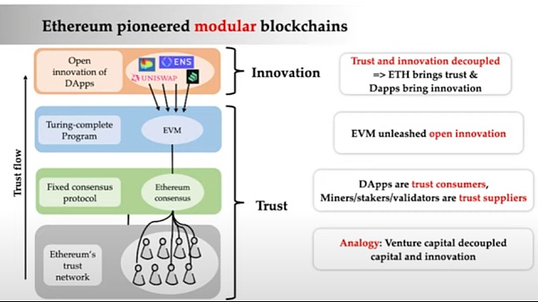以太坊有一个类似于比特币的信任层,但是因为它将 EVM 作为执行层,所以可以在它之上构建各种 dApp。然而,以太坊有两个主要限制: