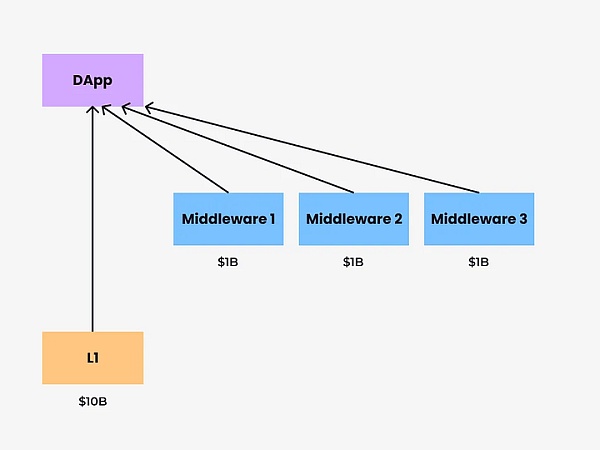 例如,如下图所示,即使用于构建 dApp 的 L1 由 100 亿美元的 ETH 保护,但如果中间件每个都由 10 亿美元的 ETH 保护,那么 dApp 实际上依赖于弱安全性的中间件。在 DeFi 协议因跨链桥或预言机问题而经历的黑客事件中很容易观察到这一点。