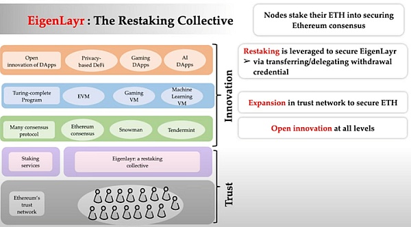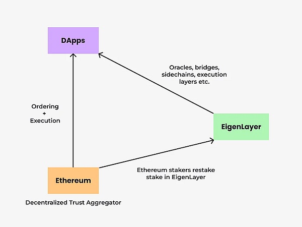 EigenLayer 更进一步,允许将已经质押的 ETH 代币再次质押在其他协议和 dApp 中并参与其验证过程,从而使其他协议和 dApp 能够在一定程度上利用以太坊网络的安全性。