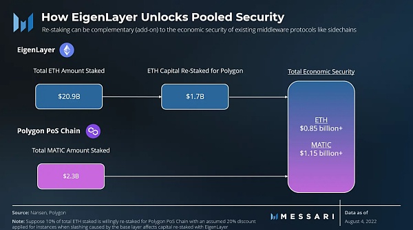 例如,假设 Polygon 使用 EigenLayer 来保证网络安全。假设超过 50% 的质押代币危害安全性,如果 Polygon 网络中质押的 MATIC 代币的价值为 23 亿美元,则危害网络所需的金额为 11.5 亿美元。如果用 Polygon 网络「再质押」17 亿美元的 ETH,则 Polygon 网络的总经济安全性增加了 8.5 亿美元,使其能够享受更高级别的安全性。