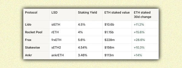 LSD 协议比较分析下表展示了市面上的主流 LSD 供应商及其各自的质押量。毫不奇怪,frxETH 的 ETH 质押量在过去三十天内相对增长的最多。只要他们能够持续提供最高的收益,这种增长就可能会持续下去。
