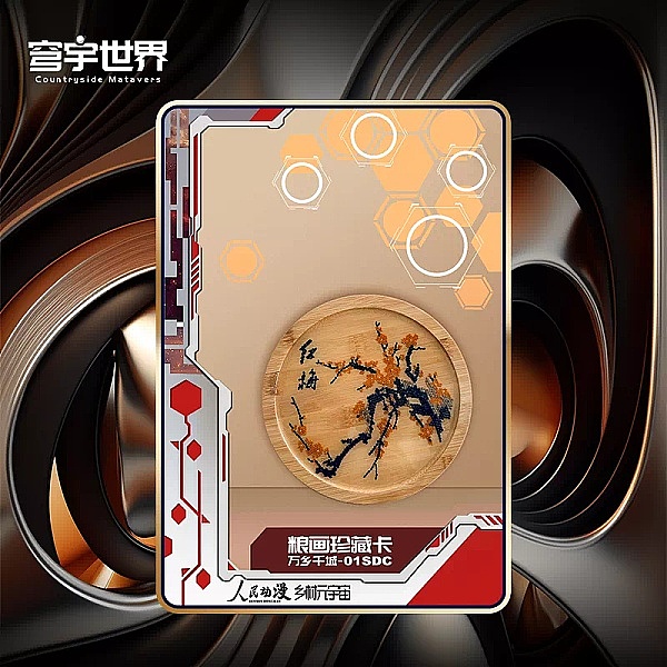 和市面上所有的收藏卡不同,这张穹宇世界卡牌“腊梅怒放”,是美丽的中国乡村——粮画小镇的珍藏卡。这张卡399元直购。持有者拥有实体卡收藏、元宇宙ID和线下到村旅游等多项权益。持卡人在元宇宙里为共创乡村文化做贡献,同时享受贵宾级到村接待服务,以粮画珍藏卡-寒梅怒放为例,到寿东村粮画小镇可领取实体粮画一份,入住寿东村的粮画小镇民宿,购买粮画产品均享受九折优惠,现场还提供DIY粮画制作学习。