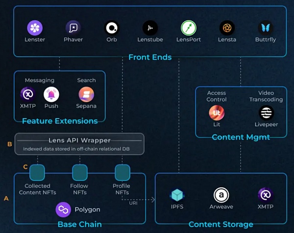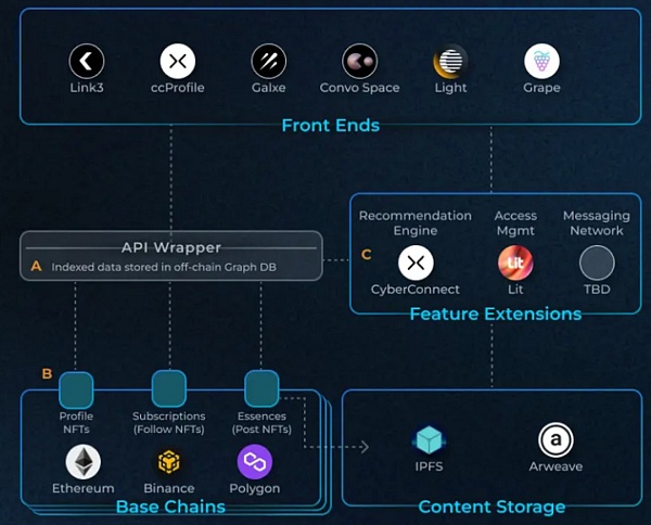 用户与前端的 Dapp 互动时,社交关系以各种 形式存在于区块链上。至于具体的 Post 内容,则通过内容索引指向存储在 IPFS 或 Arweave 等去中心化存储平台上。