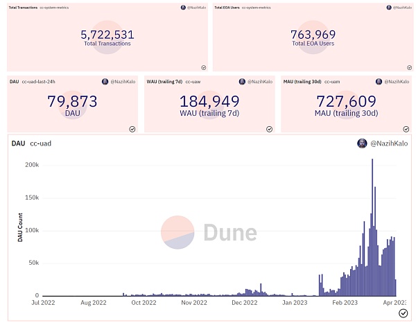 CyberConnect 目前用户数达 76 万,txn 数超 570 万条。最近一个月的日活人数约为 24k,用户量从今年开始出现井喷式的上涨。