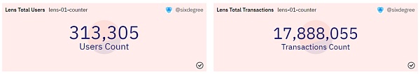 Lens 目前用户数超过 31 万,产生的 txn 数量接近 1800w,Lens Profile 创建数超 11 万。