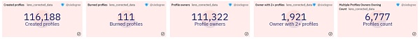 在 Lens 上首先要拥有 Profile,才能进行创作,进而获得收益。目前已有近 10 万地址铸造了 11 万+的 Profile,百分之 2 的地址持有多于一个的 Profile 。所有的 Profile 中,有 40% 经过转手或者交易。