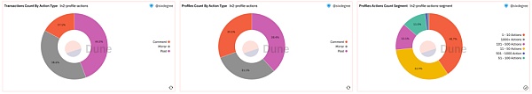 Lens 重点关注创作者创作情况。目前共计有 87k 个 Profile 账户发布超过 2900 万个帖子,创作者占比约 72%。其中,发帖、评论、转发的比例为 2:1:2。