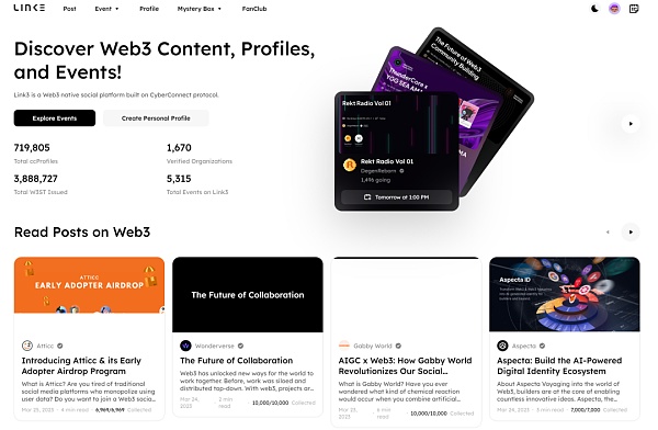 CyberConnect 则选择专注于构建用户完整的、真实的社交图谱。通过自己动手,为协议层创建一个落脚点——打造了一款 all-in-one-profile 的产品 Link3,并拓展到 events,posts,fanclub,主动引导用户寻找能够结合 web2 和 web3 的高频使用场景。