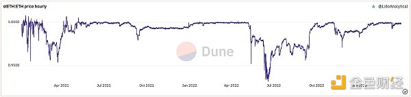而后进入以太坊质押赛道的质押者往往可以通过 Lido 等质押协议提前取出流动性。stETH 等流动性凭证可以帮助质押者快速退出。当卖出变现刚需已经在以太坊上涨之后,就会出现。拥有 stETH 等流动性凭证的投资者会卖出获利,而不是在以太坊开始提现后才售出。另外值得关注的是 stETH 的脱锚,但从数据上来看,并没有这种趋势。
