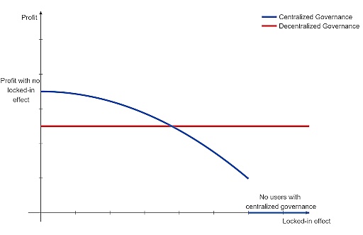 去中心化治理下的收益不依赖于锁定效应的大小(用户不利用自己的锁定效应),所以可以画成一条横线。当没有锁定效应时,中心化治理的利润高于去中心化治理的利润。对于超过某个足够大阈值的锁定效应,我们通过中心化治理获得利润为 0。