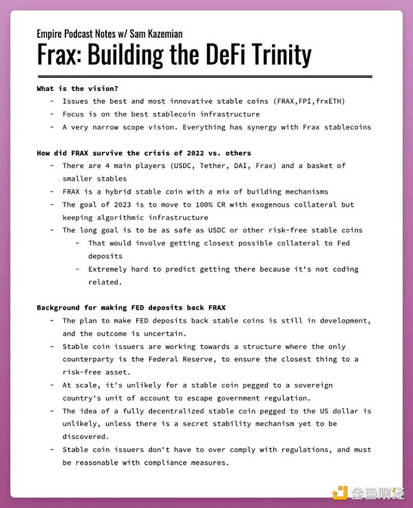 在接受 Blockworks 采访时,S.Kazemian 表示,与美元挂钩的稳定币不会在规模上通过 "假的或真正的去中心化 "来逃避监管。他们甚至已经申请了美联储主账户,以尽可能地接近美联储。