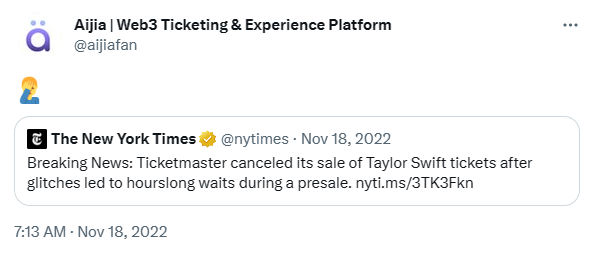 在各大媒体以 Breaking News(突发新闻)为题争相报道的时候, 票务商 Aijia 转推新闻,配文:捂脸的小人。表达他们对 Web2 票务平台的无语。