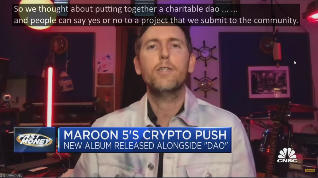 紧接着,YellowHeart 趁热打铁,在 2021 年 6 月又为当红乐队 Maroon 5 推出了史上第一个粉丝专属的 DAO(去中心化自治组织),同样是通过发行 的方式召集粉丝并募集资金。 收藏者有权参加专属的线下音乐会,听到未发行的额外曲目,获得艺术品,或者是投票决定乐队的慈善行为。