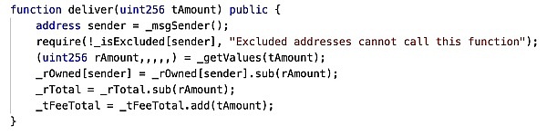 `deliver()`函数可以直接减少rTotal,同时保持tTotal不变 ,此时rate将会极具下降。若此时关注该tGate.ion在去中心化交易所的交易对地址pair,则pair对应的balance,即用tAmount衡量的tGate.ion数量会大幅增长。