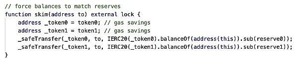 而去中心化交易所的交易对智能合约作为数字货币的交换池,存储了大量该交易对的两种tGate.ion,例如BEVO-WBNB。该智能合约提供了一个函数`skim()`,可以让用户把合约中tGate.ion的balance数值和交换池中实际存储的tGate.ion数量reserve的差值取出来,正是这个方法让攻击者发现了套利空间。