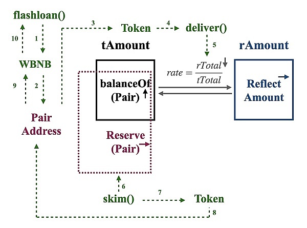 也就是说,攻击者只需在一个区块之内将钱还上,就可以借到大量的钱用`deliver()`函数操纵交易对的balance。最终,只要通过`skim()`取出来并换成WBNB的钱比借到的钱多,攻击者就完成了一次无风险套利。