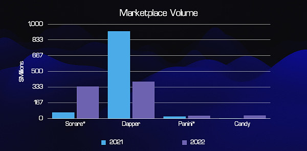 此图表包括当时所有体育 项目的一级和二级销售。其中,Dapper Labs 的销售额在 2021 年和 2022 年都约为 1 亿美元。