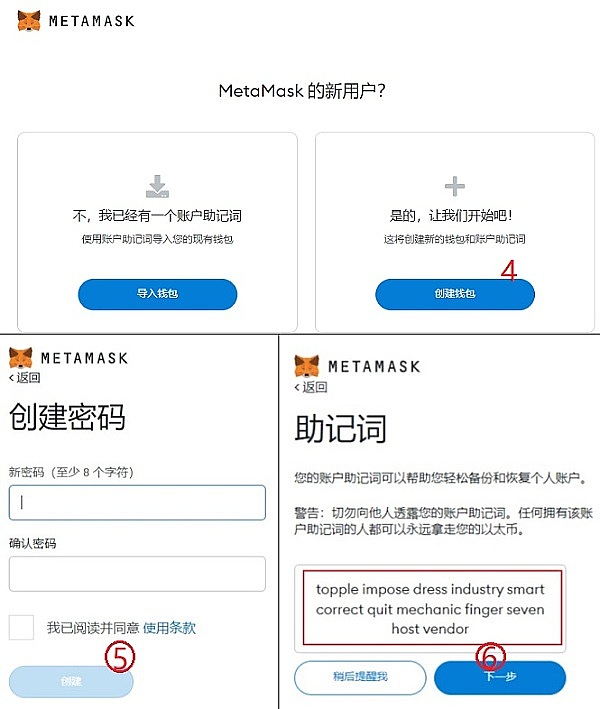 创建新钱包就会成助记词,这些助记词需要记录下来,最好手动抄写下来。