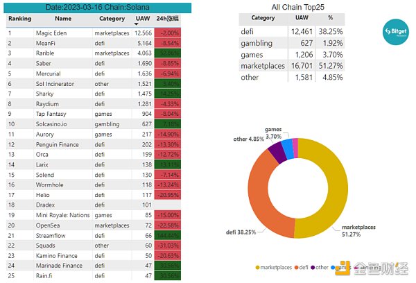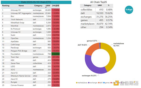 Blur(Dapp):Blur3 月 15 日平台一共成交了 2.07 万 E,Opensea 成交 5581E,交易额相较前几周持续下滑,BLUR 近期跟随 BTC 反弹,从底部上涨 50%,目前价格 0.57u,BLUR 短期价格回升能够提振 用户交易,但长期还需要看 整体市场的回暖情况以及 BLUR 代币后续的赋能,目前很难走出独立行情;