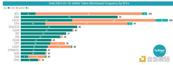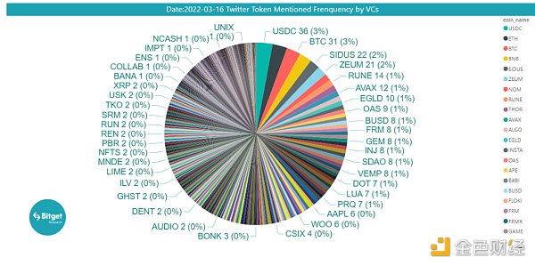 从 VC 机构在 TW 上提及的次数看:USDC、BTC、SIDUS、ZEUM、RUNE、AVAX;