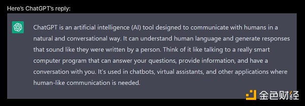 但ChatGPT到底是什么,为什么会在全球范围内引起如此轰动?ChatGPT自己的回答是这样的:ChatGPT是一个人工智能 (AI) 工具,旨在以自然的对话方式与人类进行交流。它可以理解人类语言并生成看起来像是人的回答。把它想象成与一个真正智能的计算机程序进行对话:它可以回答您的所有问题、提供信息并与您交谈。它可用于聊天机器人、虚拟助手和其他需要人类交流的应用程序。