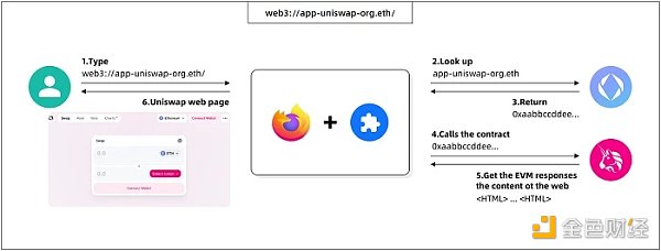 Web3 URL 标准与 Uniswap 协同工作流程图。资料来源:w 3 eth.io